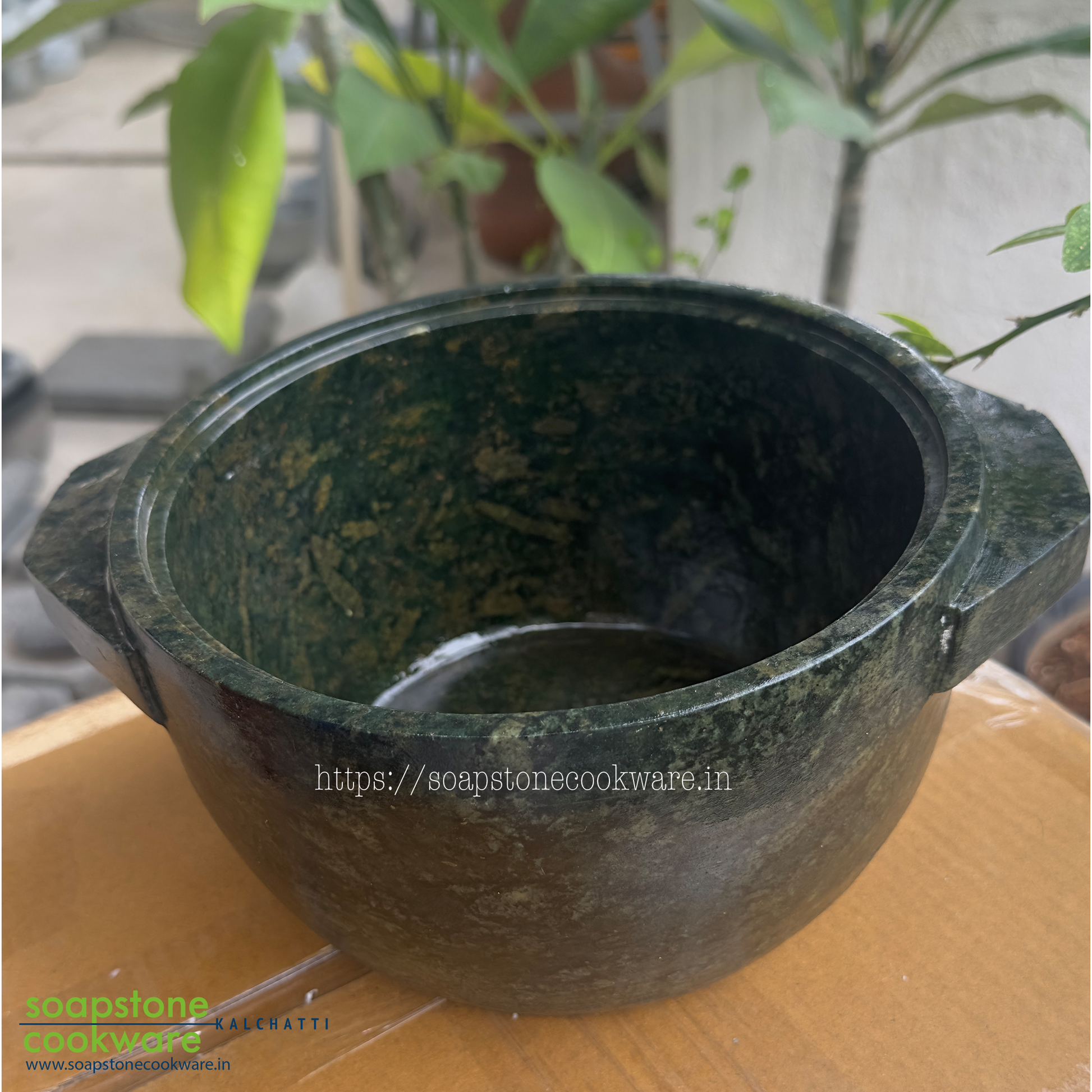 Soapstone, a naturally occurring soft stone in specific geographic areas, is manually mined By The artisans and carved Into cookware. The end to end process of mining, shaping,Carving,smooth finishing and seasoning does not involve any unnatural processing.In addition to the unadulterated natural material, the cookware also comes with high heat retention and the ability to not react with anything (food) While in contact. This is the reason why the food cooked in this traditional stoneware remains warm for a longer time and also has a higher shelf life.