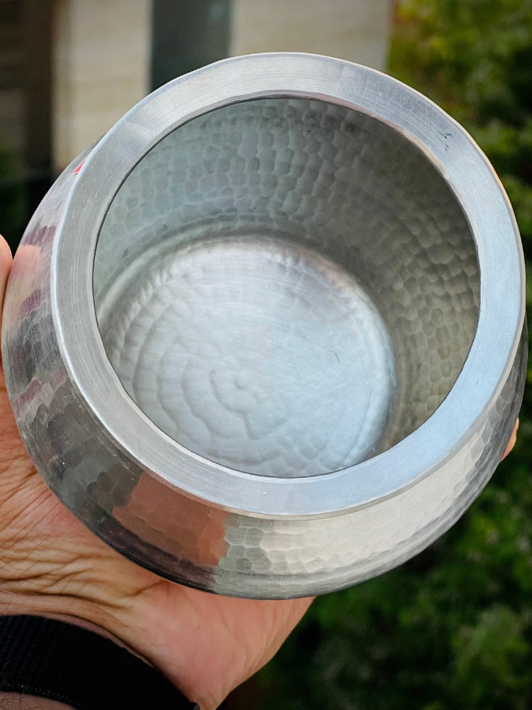 Tin has been used for centuries as a coating on copper and bronze to provide a non-corrosive cooking medium. Many scientific studies have proven that tin entering the human body exits out without reacting or staying inside. Due to its non-reactive nature, Tin is used in coating cans used for the storage of highly reactive Tomatoes. It is believed that one of the secret ingredients to enhance the taste of Rasam is to cook in Pure Tin (eeya chombu in Tamil) Vessel. Since it is a soft metal, these vessels cannot be mass-produced with machines.This beautifully handcrafted .Tin vessel can be used to make Rasam,boil milk and for making Curd. Since Tin has a low melting point, it is always advised to cook liquid items to ensure the vessel does not get overheated. An empty tin vessel on flame melts this, hence avoiding it.