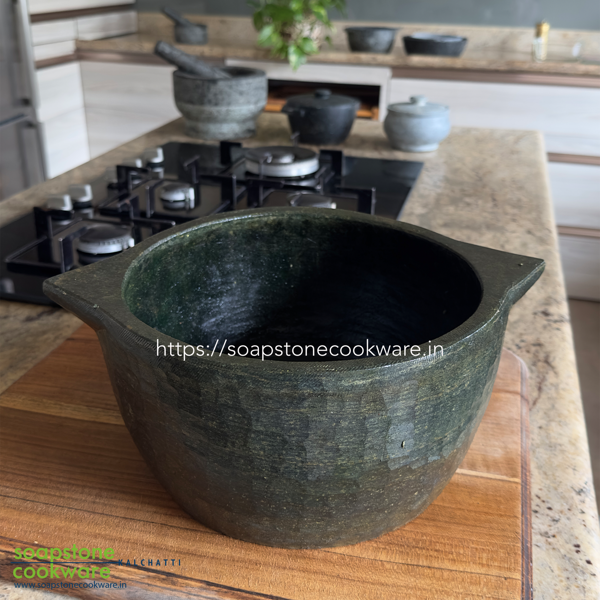 Soapstone, a naturally occurring soft stone in specific geographic areas, is manually mined By The artisans and carved Into cookware. The end to end process of mining, shaping,Carving,smooth finishing and seasoning does not involve any unnatural processing.In addition to the unadulterated natural material, the cookware also comes with high heat retention and the ability to not react with anything (food) While in contact. This is the reason why the food cooked in this traditional stoneware remains warm for a longer time and also has a higher shelf life.