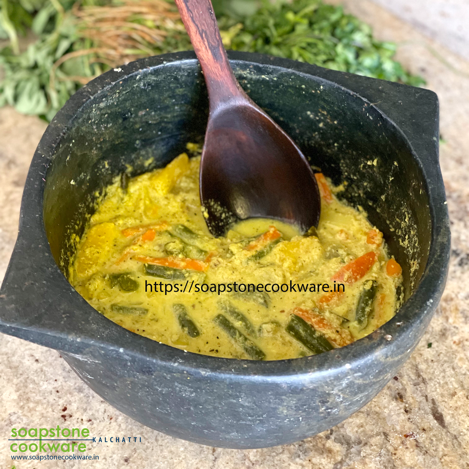 Soapstone, a naturally occurring soft stone in specific geographic areas, is manually mined By The artisans and carved Into cookware. The end to end process of mining, shaping,Carving,smooth finishing and seasoning does not involve any unnatural processing.In addition to the unadulterated natural material, the cookware also comes with high heat retention and the ability to not react with anything (food) While in contact. This is the reason why the food cooked in this traditional stoneware remains warm for a longer time and also has a higher shelf life.