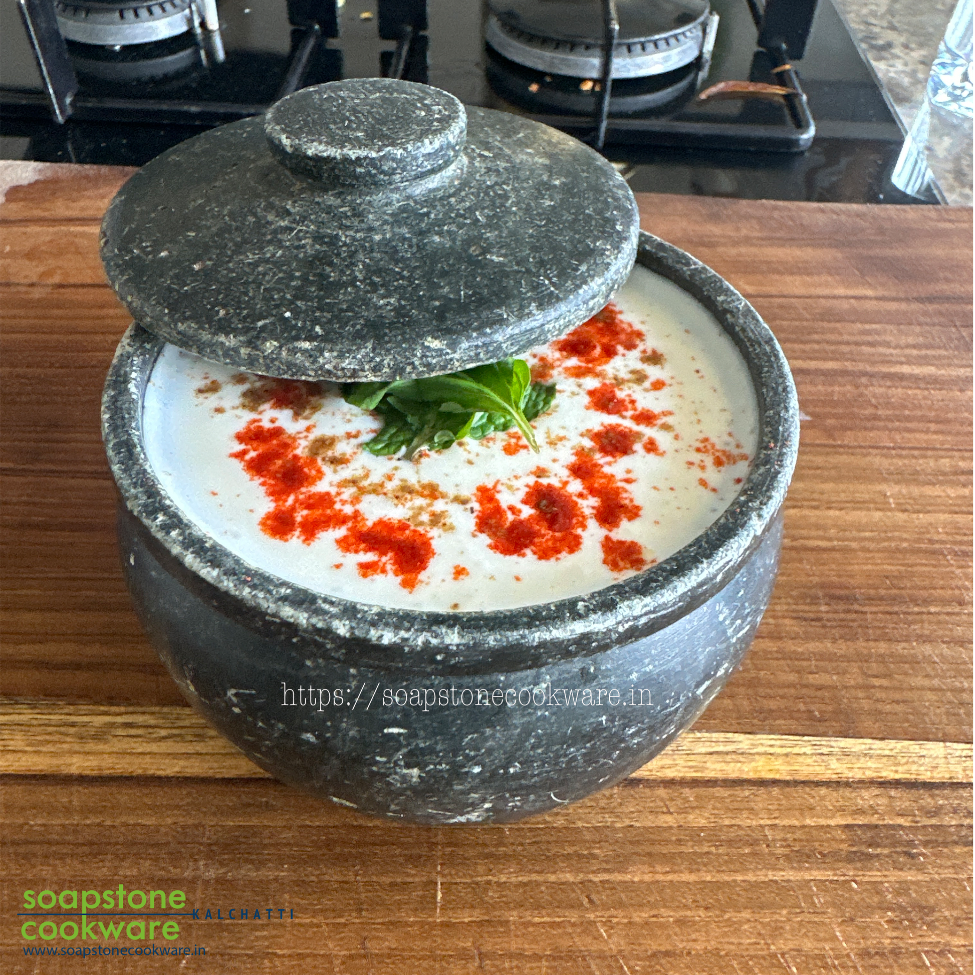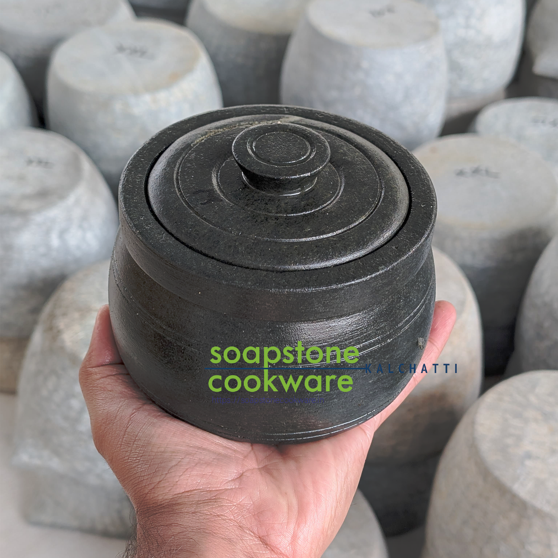 Soapstone, a naturally occurring soft stone in specific geographic areas, is manually mined By The artisans and carved Into cookware. The end to end process -of mining, shaping, Carving, smooth finishing and seasoning does not involve any unnatural Processing. In addition to the unadulterated natural material, the cookware also comes with high heat retention and the ability to not react with anything (food) While in contact. This is the reason why the food cooked in this traditional stoneware Remains warm for a longer time and also has a higher shelf life.